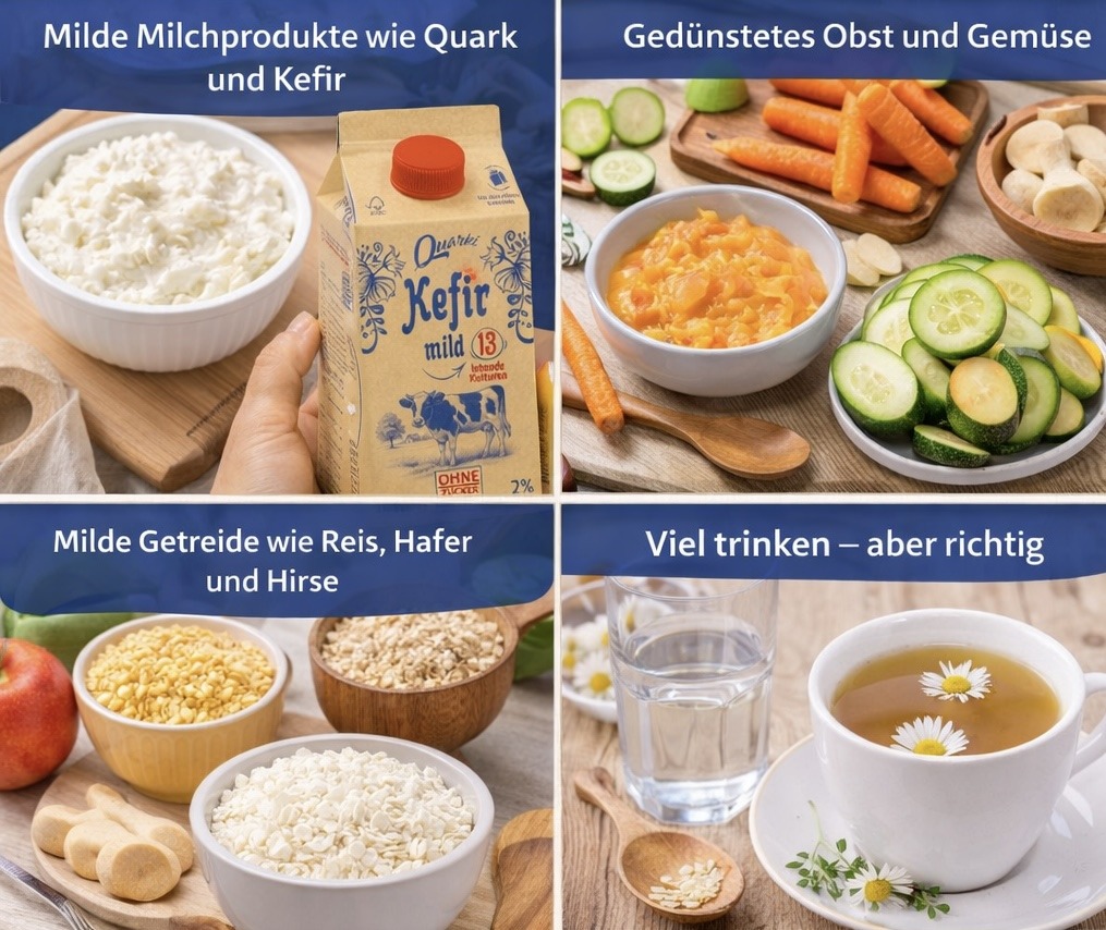 Fermentierte Milchprodukte wie Quark oder Kefir sind besonders bekömmlich. Unser traditionell hergestellter Quark enthält keine Zusatzstoffe und ist reich an Eiweiß und Kalzium, ideal für eine sanfte Ernährung. Kefir liefert zusätzlich probiotische Kulturen, die helfen können, die Darmflora im Gleichgewicht zu halten.